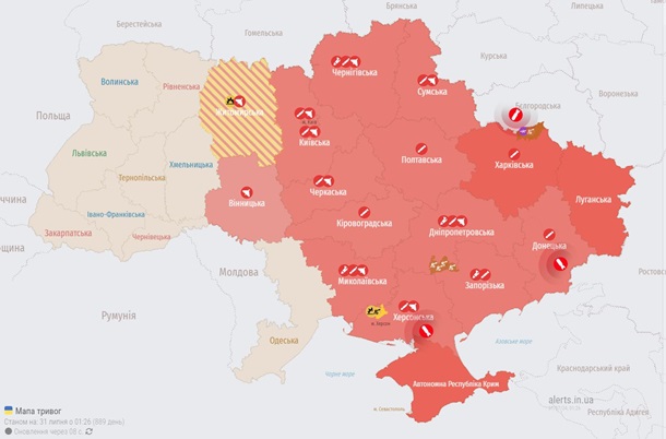 У ніч проти середи, 31 липня, у небі України знаходяться близько 40 ворожих безпілотників. При цьому нові групи дронів продовжують залітати. Про це повідомляють моніторингові канали.