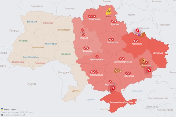 Увечері у вівторок, 30 липня, східну половину України охопила повітряна тривога через ворожі БПЛА та ракетну небезпеку. У Києві, Білій Церкві та під Полтавою чули вибухи, повідомляє Суспільне.