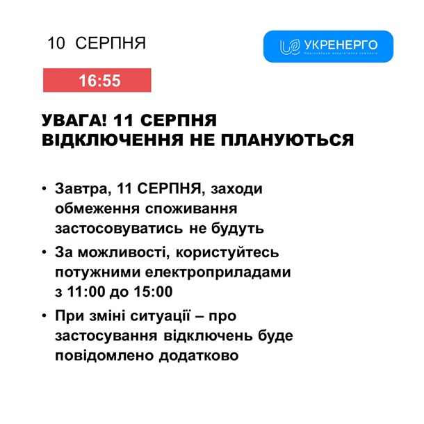 У неділю, 11 серпня, планових знеструмлень не передбачено, повідомляє НЕК Укренерго.
