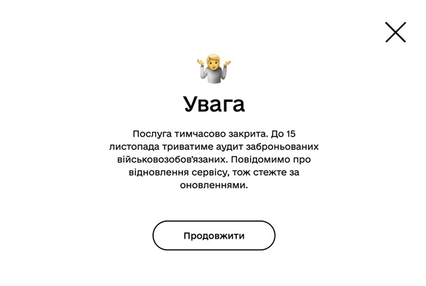 «Система видає таке повідомлення: «Послуга тимчасово закрита. До 15 листопада триватиме аудит заброньованих військовозобов’язаних. Повідомимо про відновлення сервісу, тож слідкуйте за оновленнями», — зазначає видання.