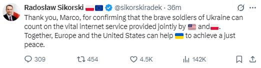«Дякую, Марко, за підтвердження того, що відважні українські армійці можуть розраховувати на життєво важливий інтернет-сервіс. Спільно Європа та Сполучені Штати можуть допомогти Україні досягти справедливого миру», — написав Сікорський.