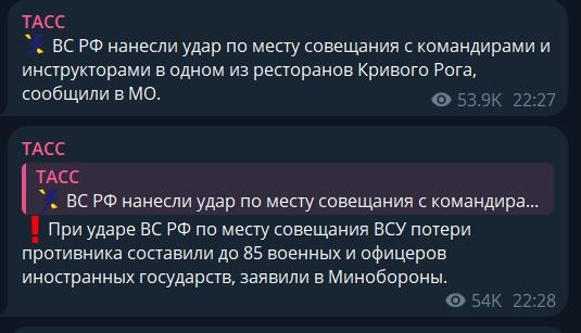 У Міноборони Росії заявили, що завдали удару по Кривому Рогу, де начебто відбувалася нарада з іноземними інструкторами і командирами, повідомили росЗМІ.