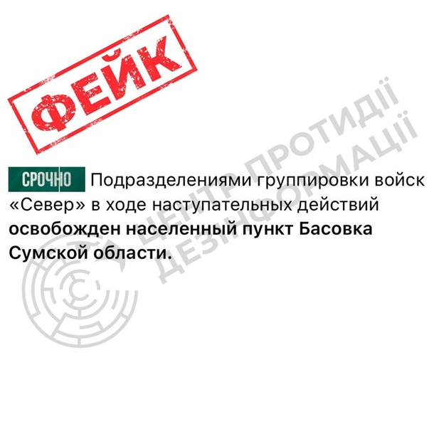 У Центрі протидії дезінформації наголосили, що інформація про те, що росіяни нібито взяли під контроль Басівку на Сумщині – насправді фейк. Про це мовиться у заяві ЦПД у неділю, 6 квітня.