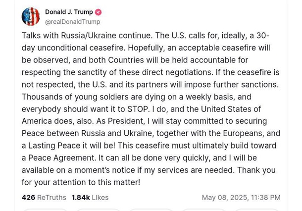 Президент США Дональд Трамп заявив, що переговори щодо припинення вогню в Україні тривають і пригрозив санкціями за його порушення. Про це він у четвер, 8 травня написав у соцмережі Truth Social невдовзі після телефонної розмови з президентом Володимиром Зеленським.