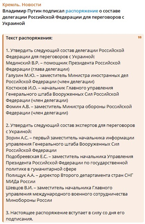 Очолить делегацію Володимир Мединський — помічник Путіна, що у 2022 році вже був головою російської переговорної групи, коли українська та російські делегації зустрічались у Стамбулі.