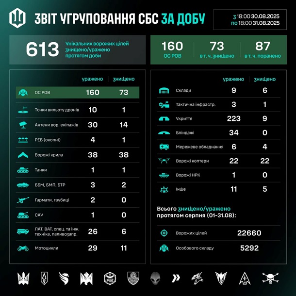 Всього протягом серпня знищено/уражено 22660 цілей, з яких 5292 — особовий склад противника.