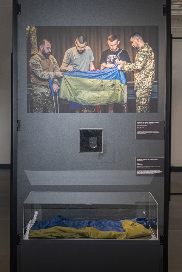 Серед експонатів — прапор України, врятований із заводу Азовсталь та вивезений гелікоптером під час військової операції, який символізує незламність українського народу