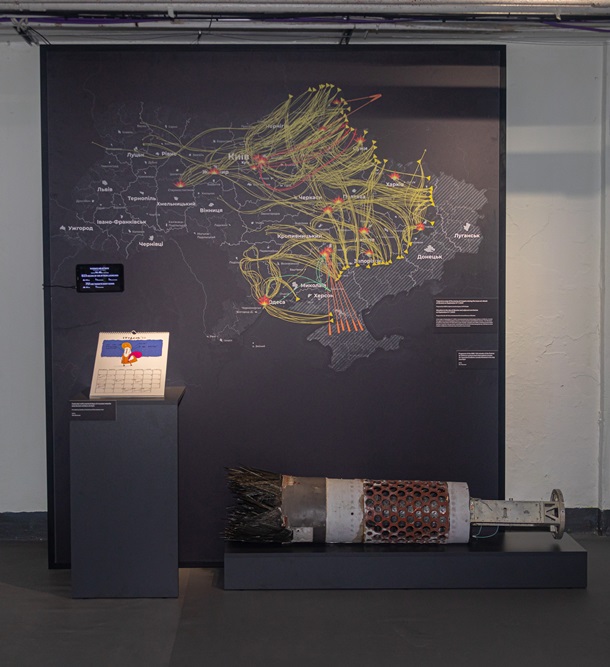 Оперативна карта масованої атаки російских дронів на Україну та фрагмент ракети від ЗРК «Патріот», які свідчать про щоденний терор мирного населення України російськими загарбниками