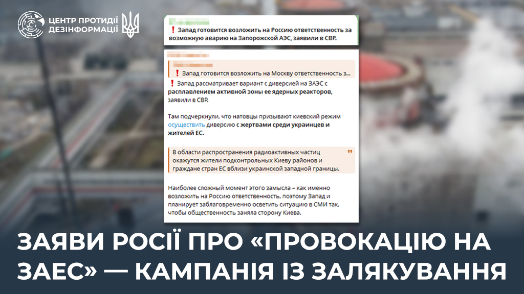 Служба зовнішньої розвідки РФ (СВР) заявила про те, що нібито «Захід готується звинуватити Москву у можливій аварії на Запорізькій атомній електростанції», а «натовці закликають Київ здійснити диверсію на ЗАЕС з жертвами серед українців і жителів країн ЄС».